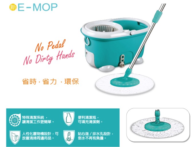 「免腳踩」、「不沾手」、「方便拖」打掃、拖地,最怕拖把洗不乾淨,【新‧E-MOP拖把】可以解決您的困擾桶子是雙水槽設計,一邊洗拖把、一邊脫水擰乾在水槽中間有一個特殊清潔系統,垂直與人呈現90度對準中間的清洗軸,上、下施力,它就會像洗衣機一樣旋轉,可以先將拖把布洗淨,再把拖把布擰乾。拖把布盤,要多乾有多乾!!不留水痕,不沾手,就是這麼輕鬆省力喔!
