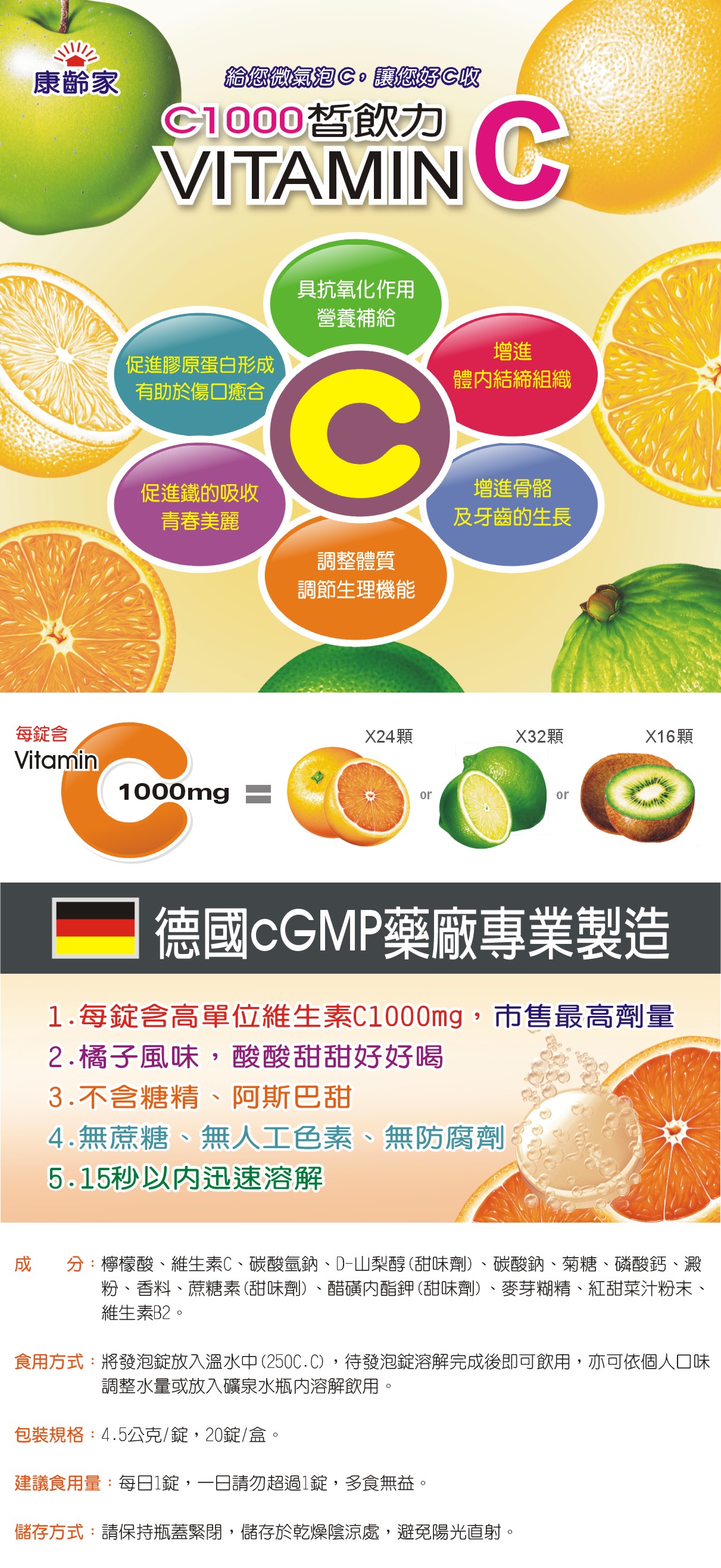※維生素C:可補充每日所需,促進膠原蛋白的形成,具抗氧化作用,讓您青春美麗。