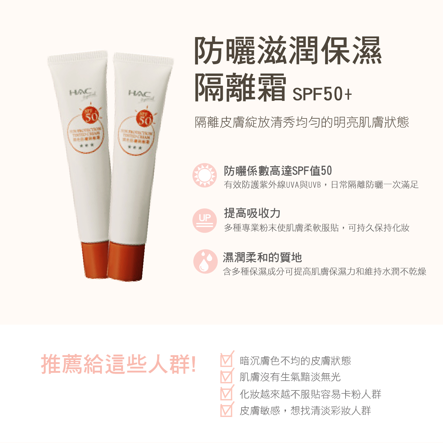 1.同時有效防護紫外線UVA與UVB,日常隔離防曬需求一次滿足