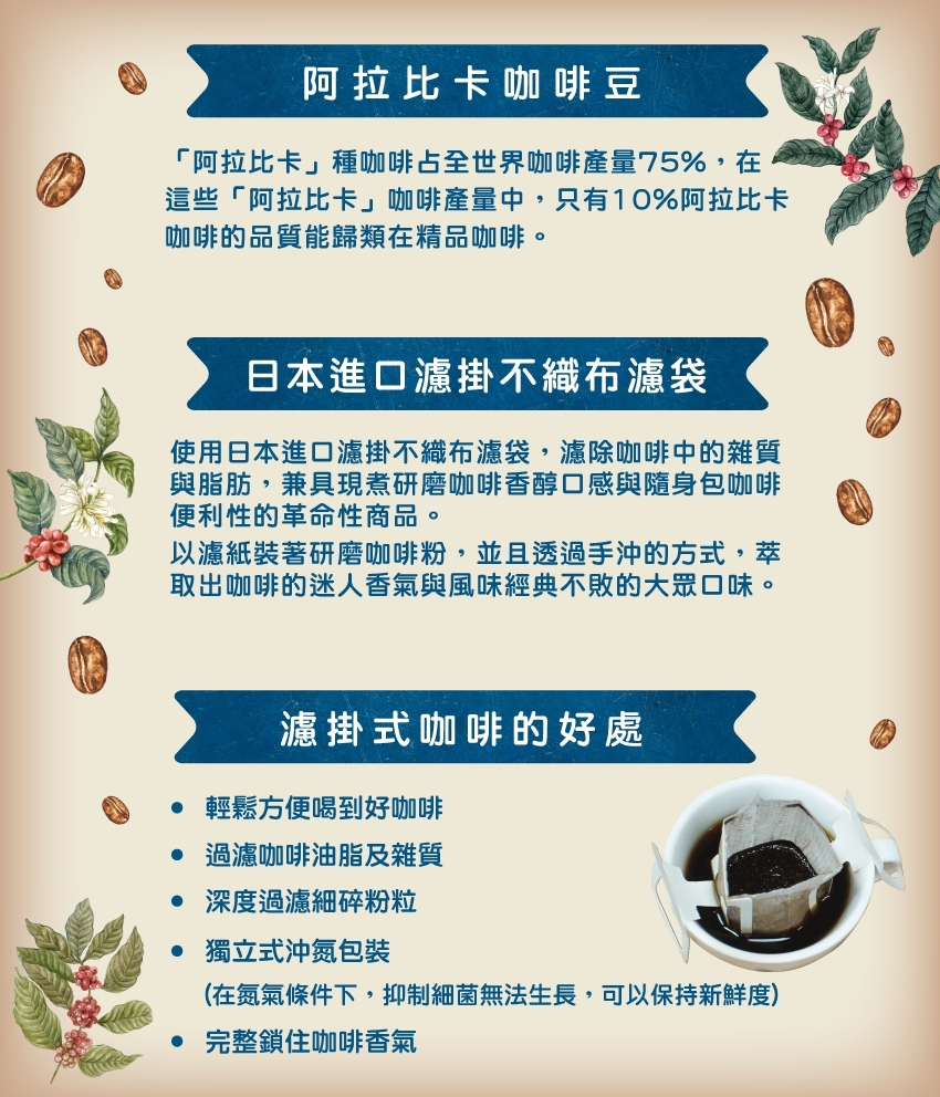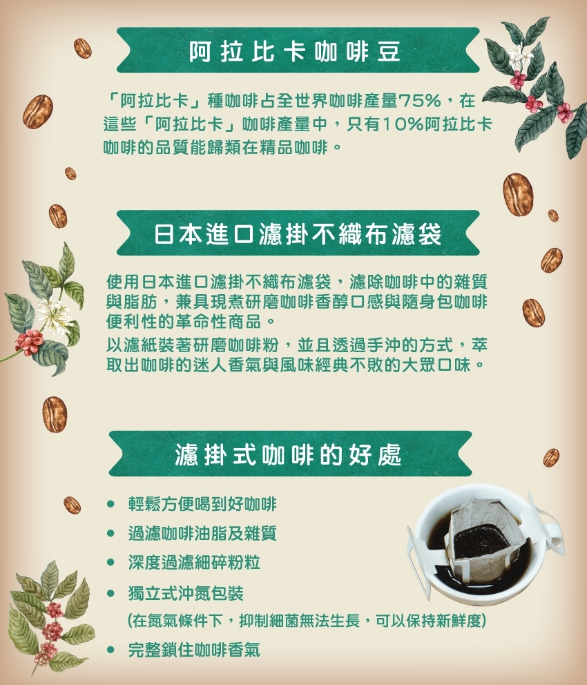 使用日本進口濾掛不織布濾袋,濾除咖啡中的雜質與脂肪,兼具現煮研磨咖啡香醇口感與隨身包咖啡便利性的革命性商品。以濾紙裝著研磨咖啡粉,並且透過手沖的方式,萃取出咖啡的迷人香氣與風味經典不敗的大眾口味。
